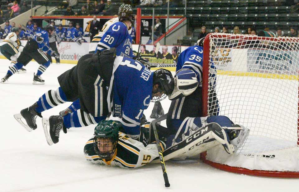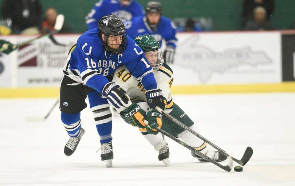 NMU’s Jordan Klimek (40) fights for the puck against Alabama’s Doug Reid (16) Friday, Oct. 31, 2014. (photo by Ron Caspi)