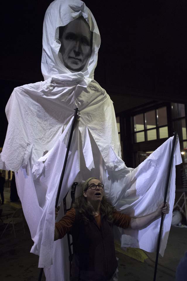 Debbie White works the arms of a giant puppet to be part of the show at the Halloween Spectacle at The Commons in Marquette, MI. (photo by Ron Caspi)