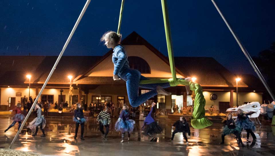 An aerial artist poses in the foreground as dancers enact a scene from the 2014 Halloween Spectacle. (photo by Ron Caspi)