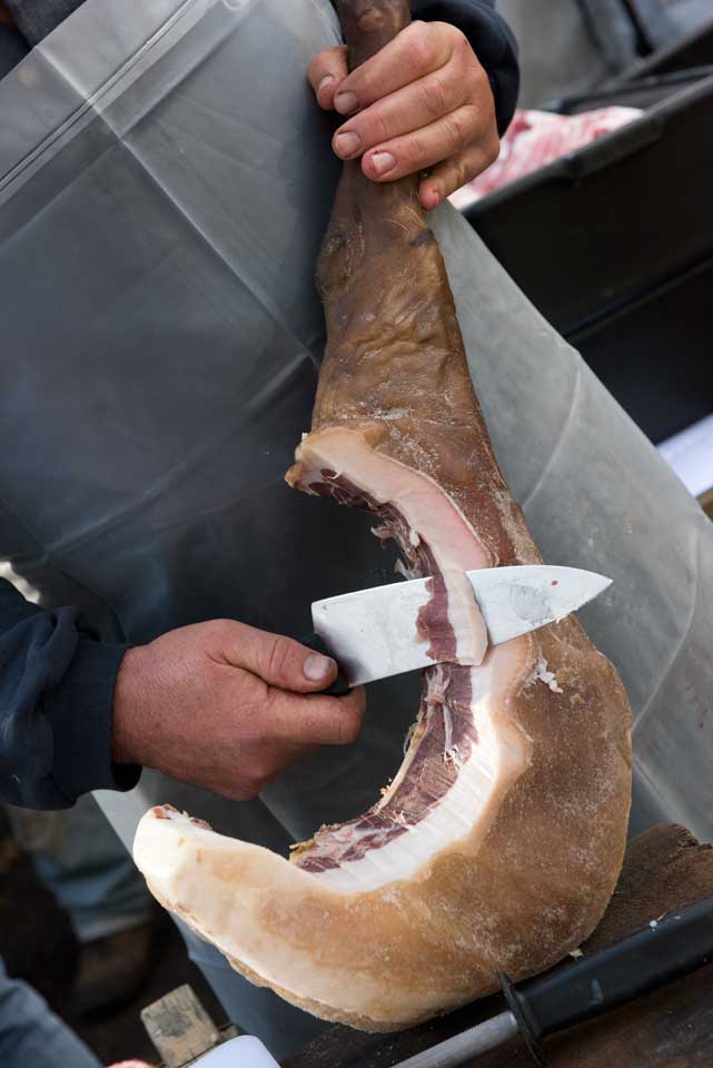Mark Baker slices off a piece prosciutto from a hog harvested and preserved using traditional salt curing techniques. A cured leg of prosciutto like this can go for $1500 for chefs serving high end cuisine.