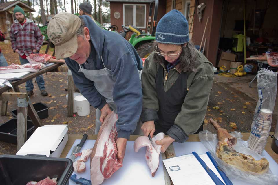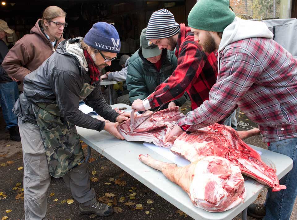 Workshop attendees had the chance to practice butchering techniques as they processed the meat to be cured and preserved for eating. (photo by Ron Caspi)