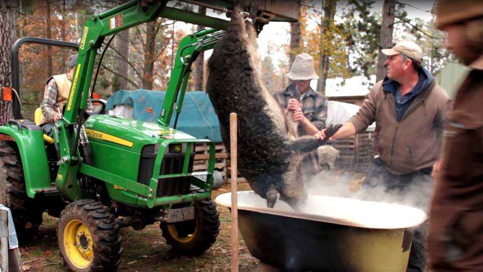 A hog is placed into scalding water to make removal of hair easier at a workshop meant to teach traditional farming techniques. (photo by Scott Lawrence/Upper Productions)