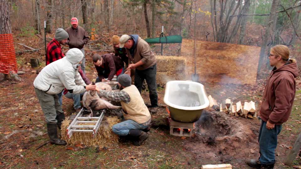 A community of people work together to remove hair from hogs during a Hog Harvest workshop at the Shady Grove Farm in Gwinn, MI. ( photo by Scott Lawrence/ Upper Productions)