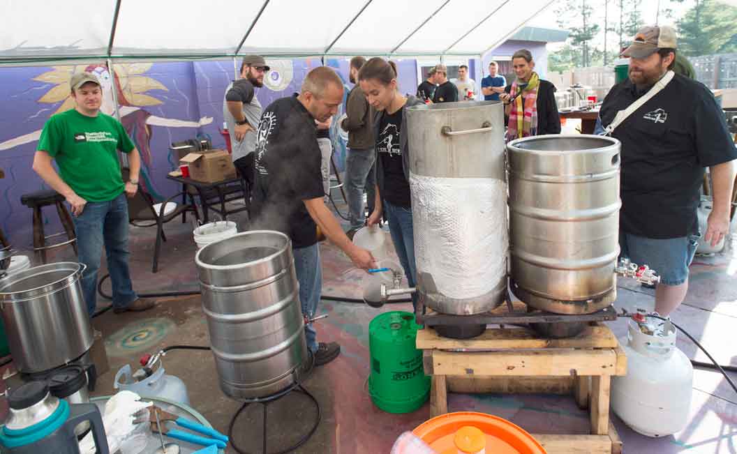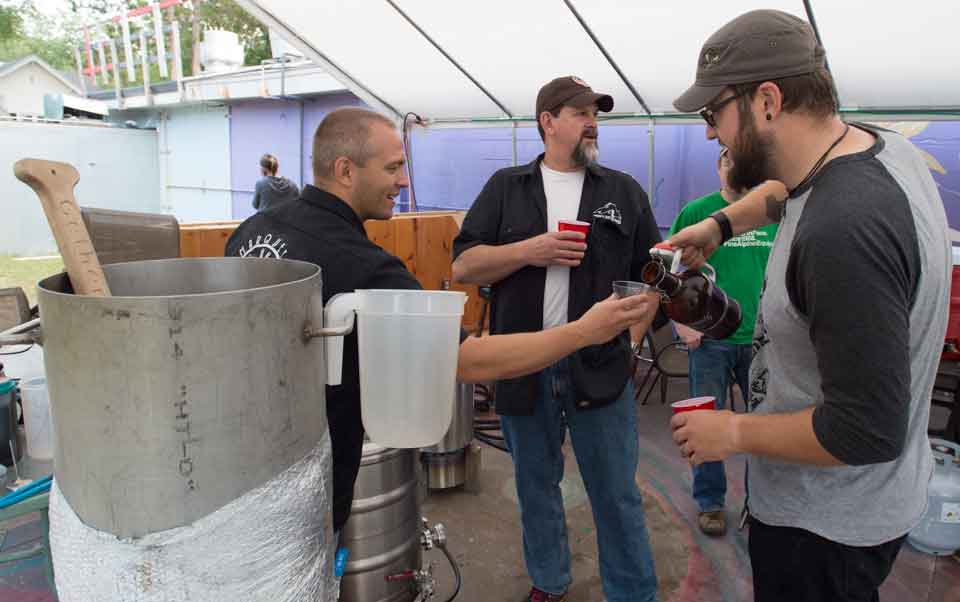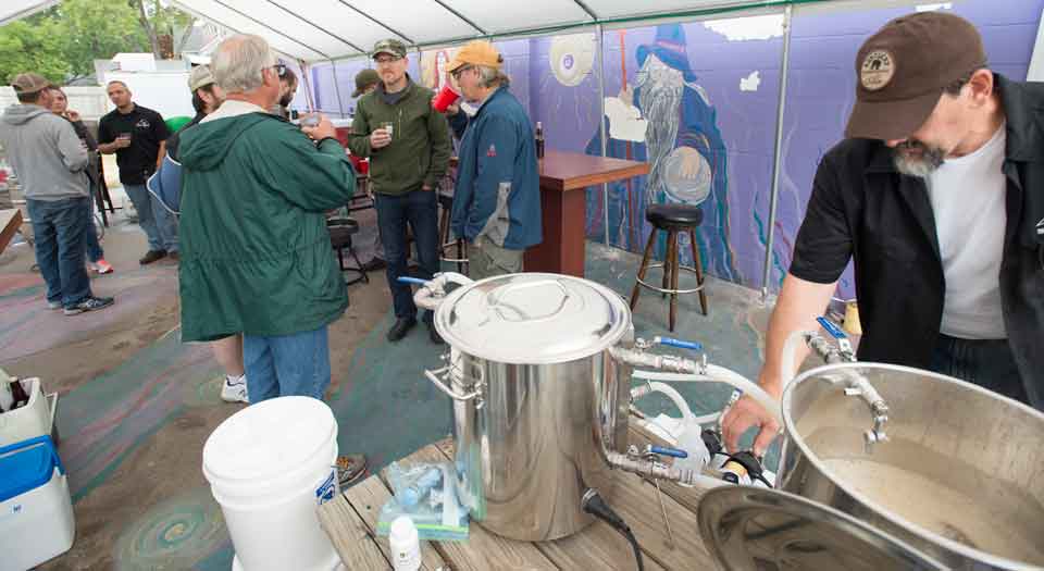 Jeff Brickey (far right) tends to his brewing rig while other club members socialize. (photo by Ron Caspi)