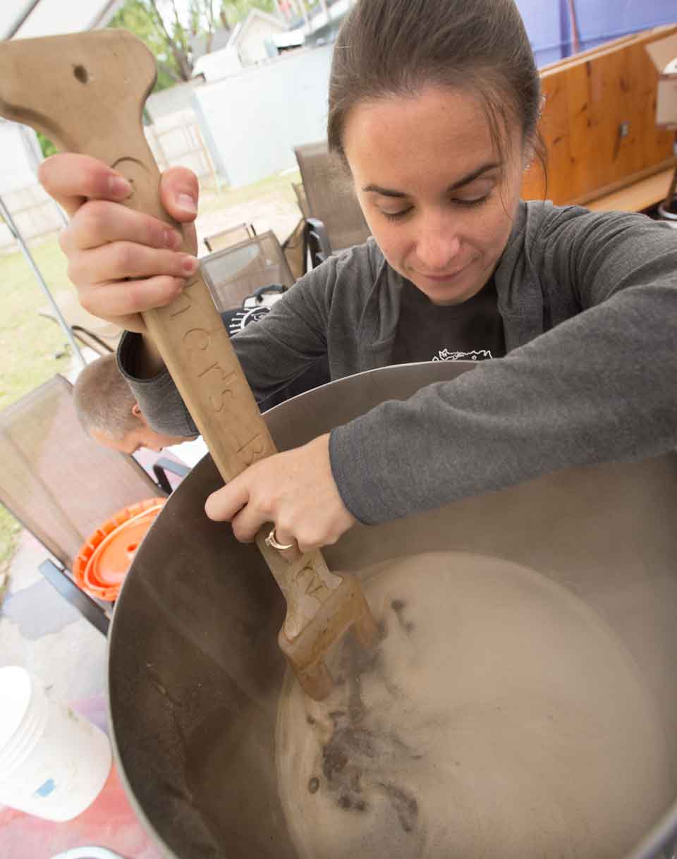 Jill Gethers of Shooters Firehouse and Brew Pub in Munising, stirs the mash as part of the brewing process. (photo by Ron Caspi)