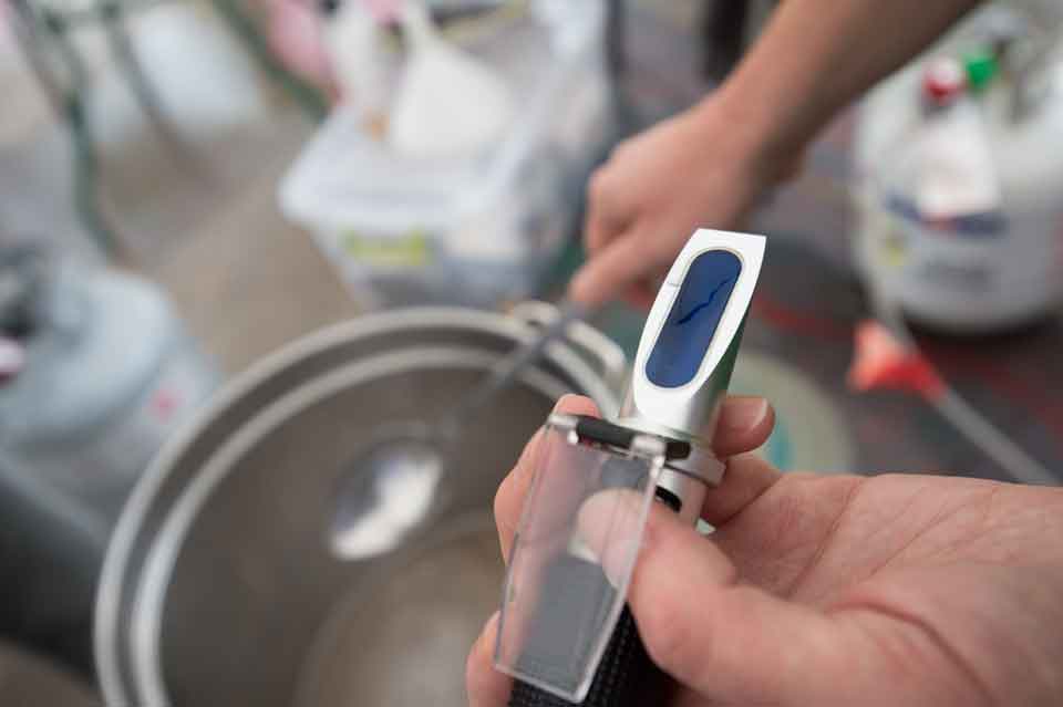 Jeff Brickey (left) tests the pH of his mash with the help of Jill and Chris Gethers of Shooters Firehouse and Brew Pub in Munising, during a Marquette Home Brewers big brew day gathering in September 2014. (Ron Caspi)
