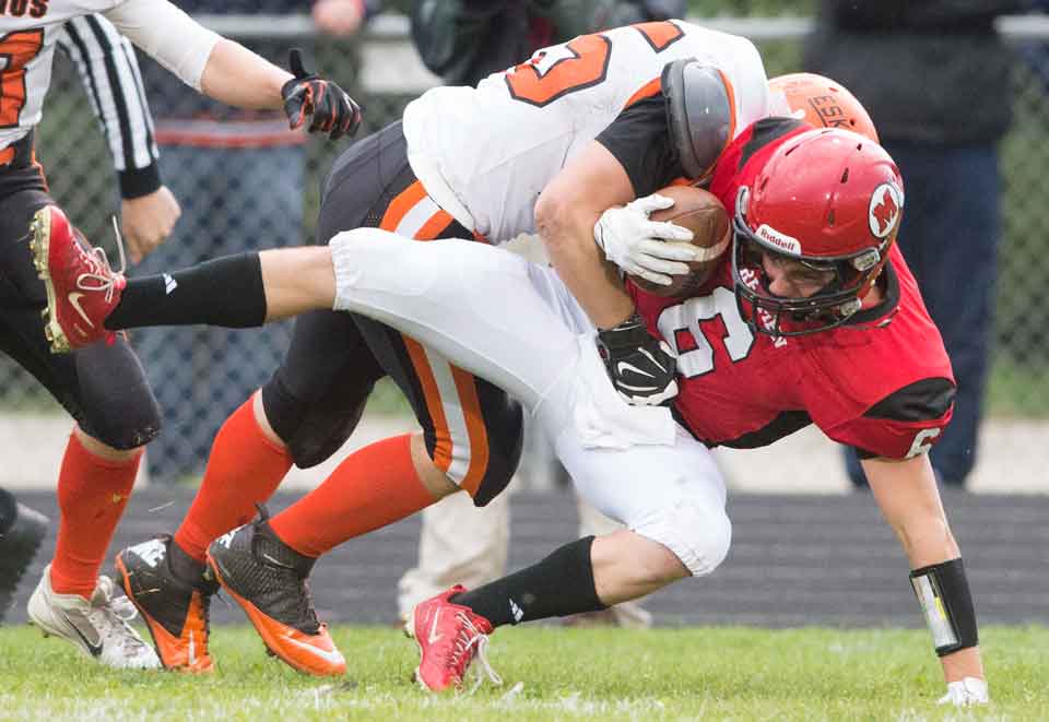 Patrick Burmeister gets taken down during the Marquette vs Escanaba varsity football game Friday, September 19, 2014 in Marquette, MI. (photo Ron Caspi)