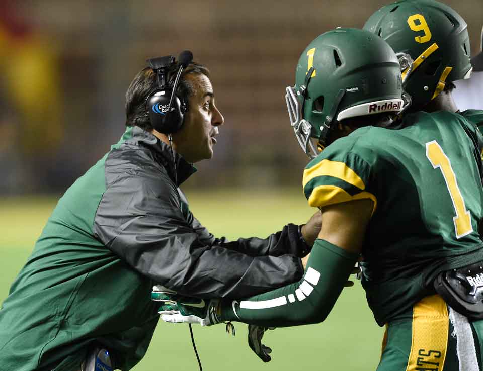 NMU Head Coach Jeff Ostrowski ramps up his players during the Miner’s Cup football game against longtime rivals MTU. (photo by Ron Caspi)