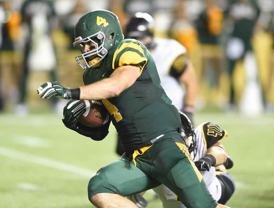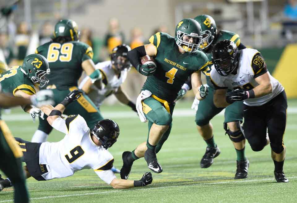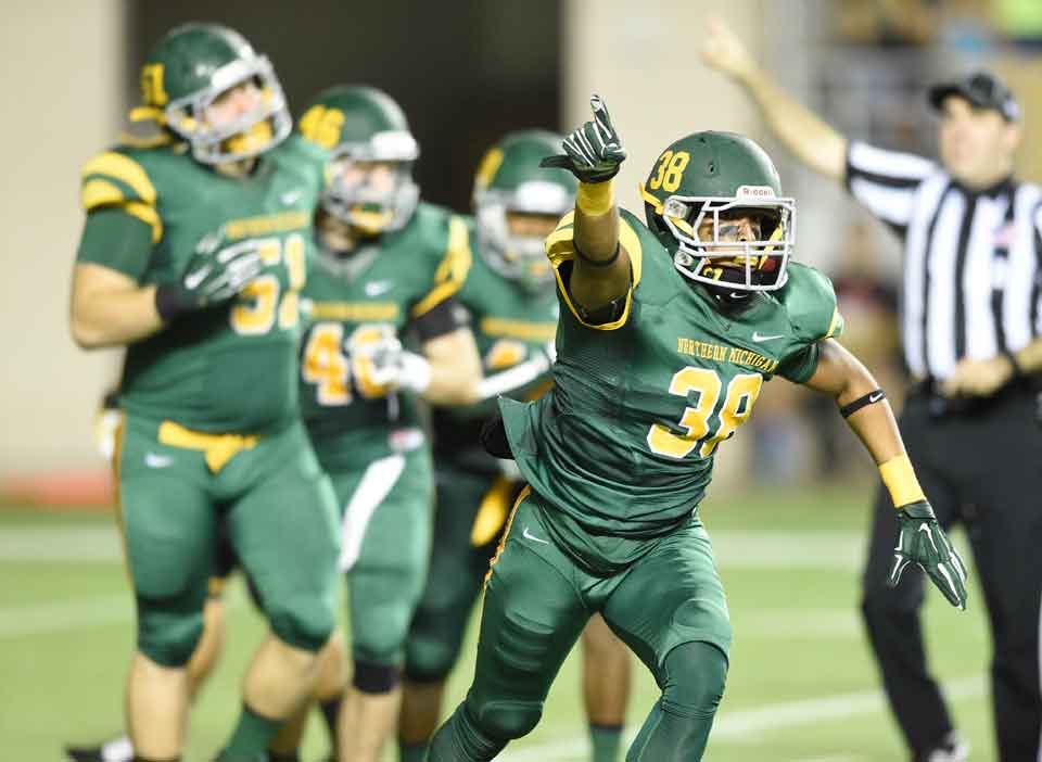 Mark Walker celebrates an NMU touchdown during their rivalry football game against MTU for the 2014 Miner’s Cup trophy. (photo by Ron Caspi)