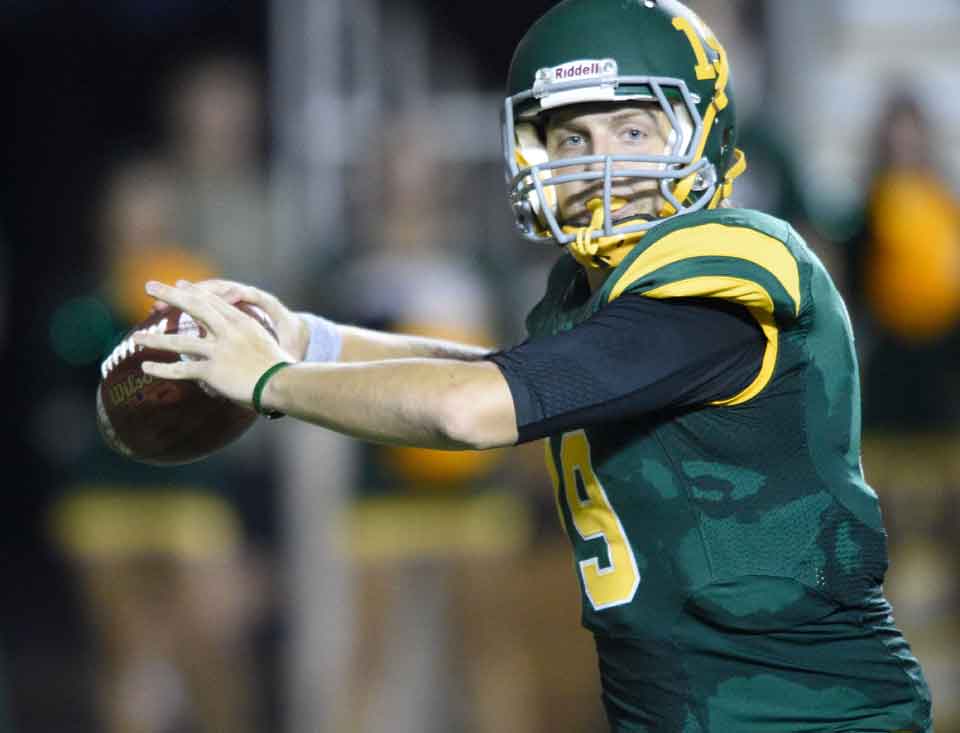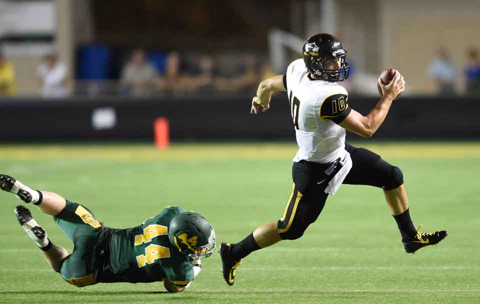 Huskies quarterback, Tyler Scarlett (10) just escapes getting tackled as he runs with the ball. (photo by Ron Caspi)