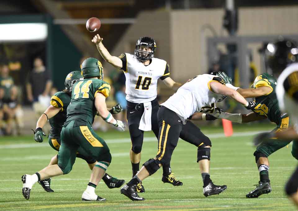 Tyler Scarlett (10) of the MTU Huskies tries to get past NMU defense during the Miner’s Cup football game at the Superior Dome , Saturday, Sept. 27, 2014. (photo by Ron Caspi)