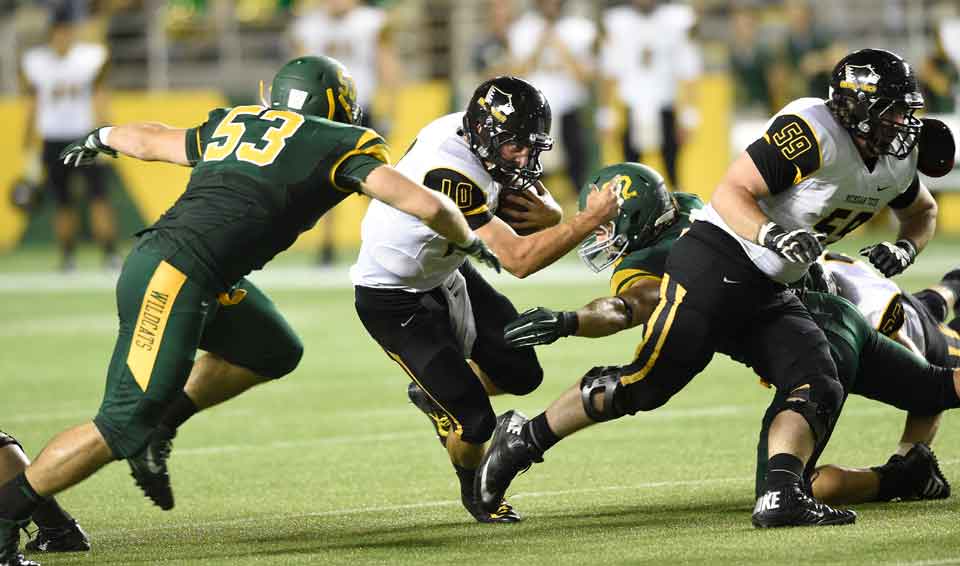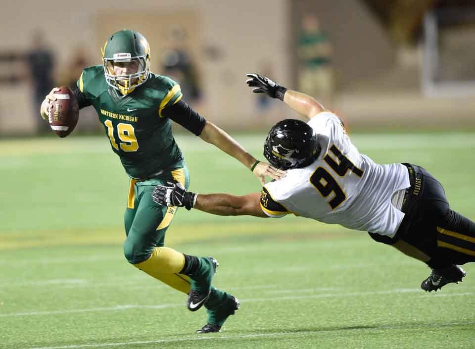 Shaye Brown (19), quarterback for the NMU Wildcats pushes past MTU defensive lineman, Tanner Agen (94). (photo by Ron Caspi)