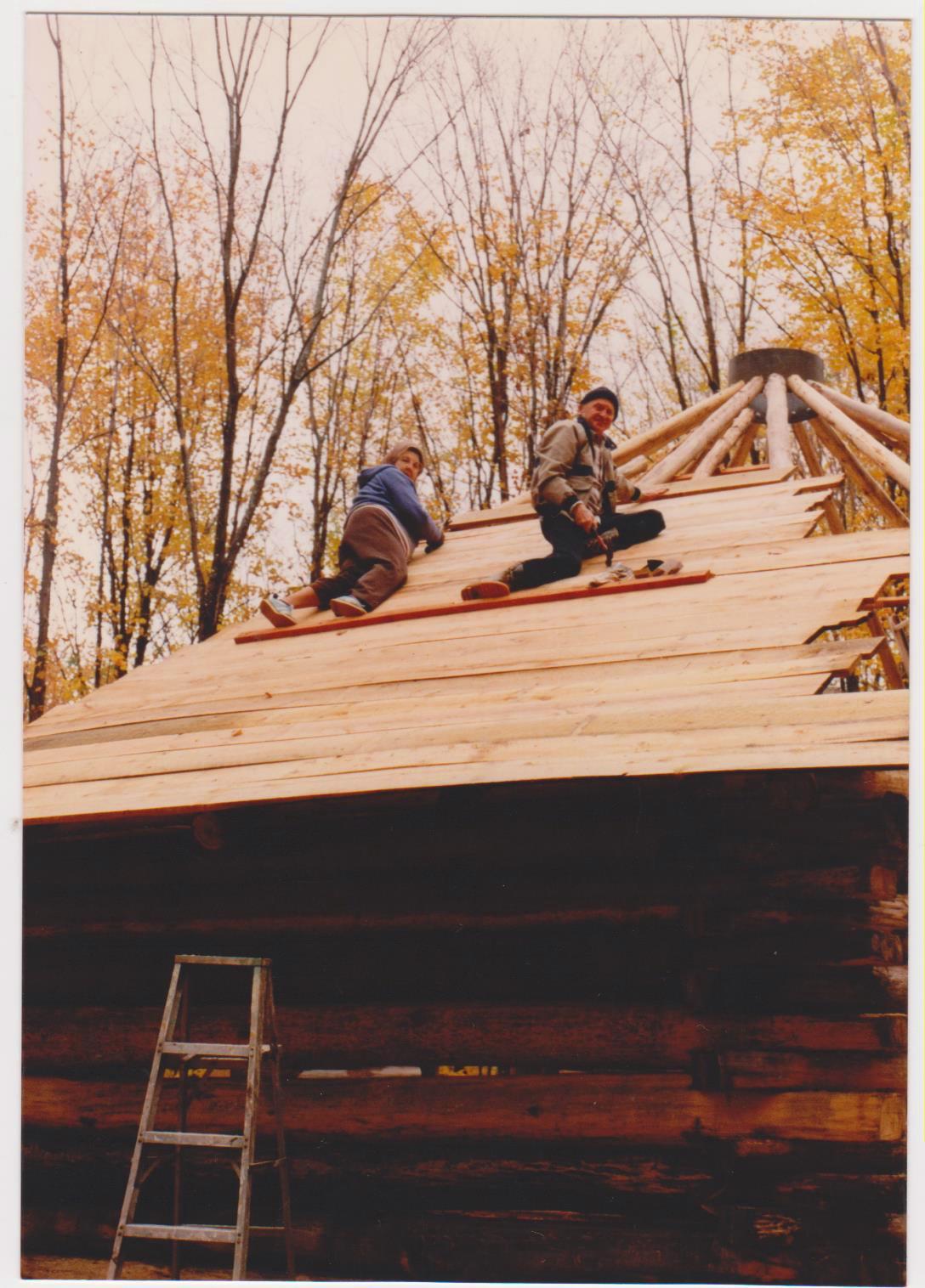 her dad nailing down the boards on the Zender and Dale home roof in the