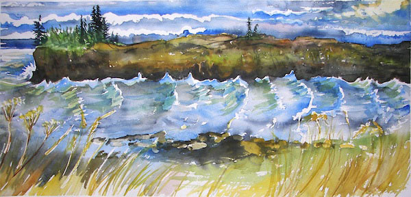 Watercolor painting of waves at Scoville Point in Michigan’s Upper Peninsula by Kathleen Heideman. (photo courtesy of Kathleen Heideman)