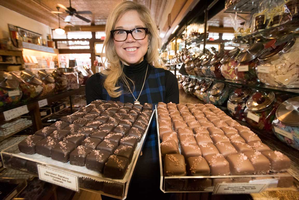 Emily Lanctot, Marketing Director at Donckers holds up display trays of dark and milk chocolate sea salt caramels at the candy store in downtown Marquette, MI. (photo by Ron Caspi)